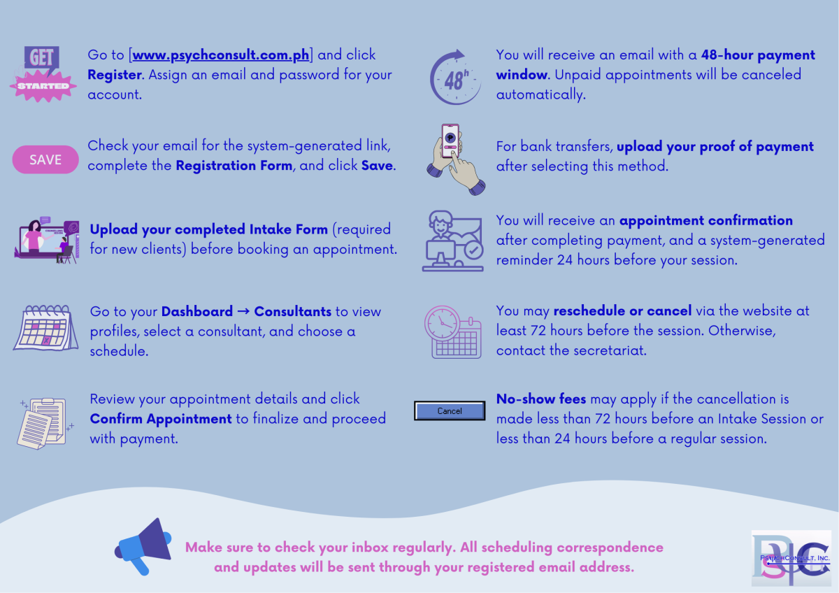 If you wish to schedule a PSYCHOLOGICAL ASSESSMENT, you may reach out to us through Viber 0917 808 0193, landline 8421 2469, or email [contact@psychconsult.com.ph]